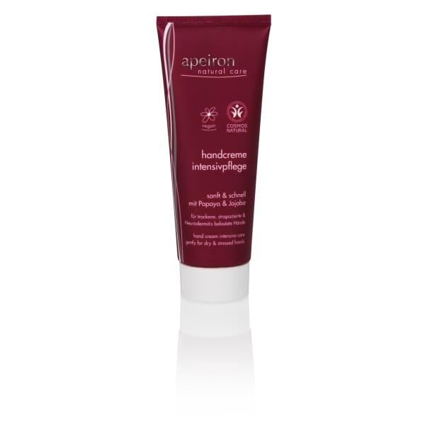 Apeiron Hand Cream Intensive Care cares for dry, heavily stressed, cracked and sensitive skin on hands, nail beds and elbows, making it soft and caressing again. Plant active ingredients from baobab, jojoba and papaya give the skin new suppleness, regeneration and natural protection. Absorbs immediately and completely without leaving a greasy film - the ideal pampering care for in between and an indispensable everyday companion with a subtle, fresh fragrance. Suitable for diabetics.